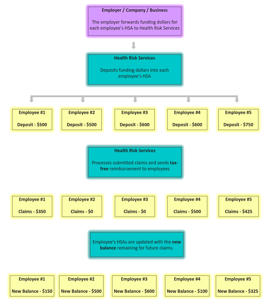 HSAs are 100% funded by the employer, who sets a predetermined contribution amount for each employee. Funding can be done monthly, annually, or on a pay-as-you-go basis.